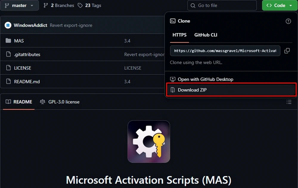 На страницу проекта MAS жмем на зеленую кнопку “CODE” а в выпадающем меню – Download ZIP и скачиваем архив с активатором.