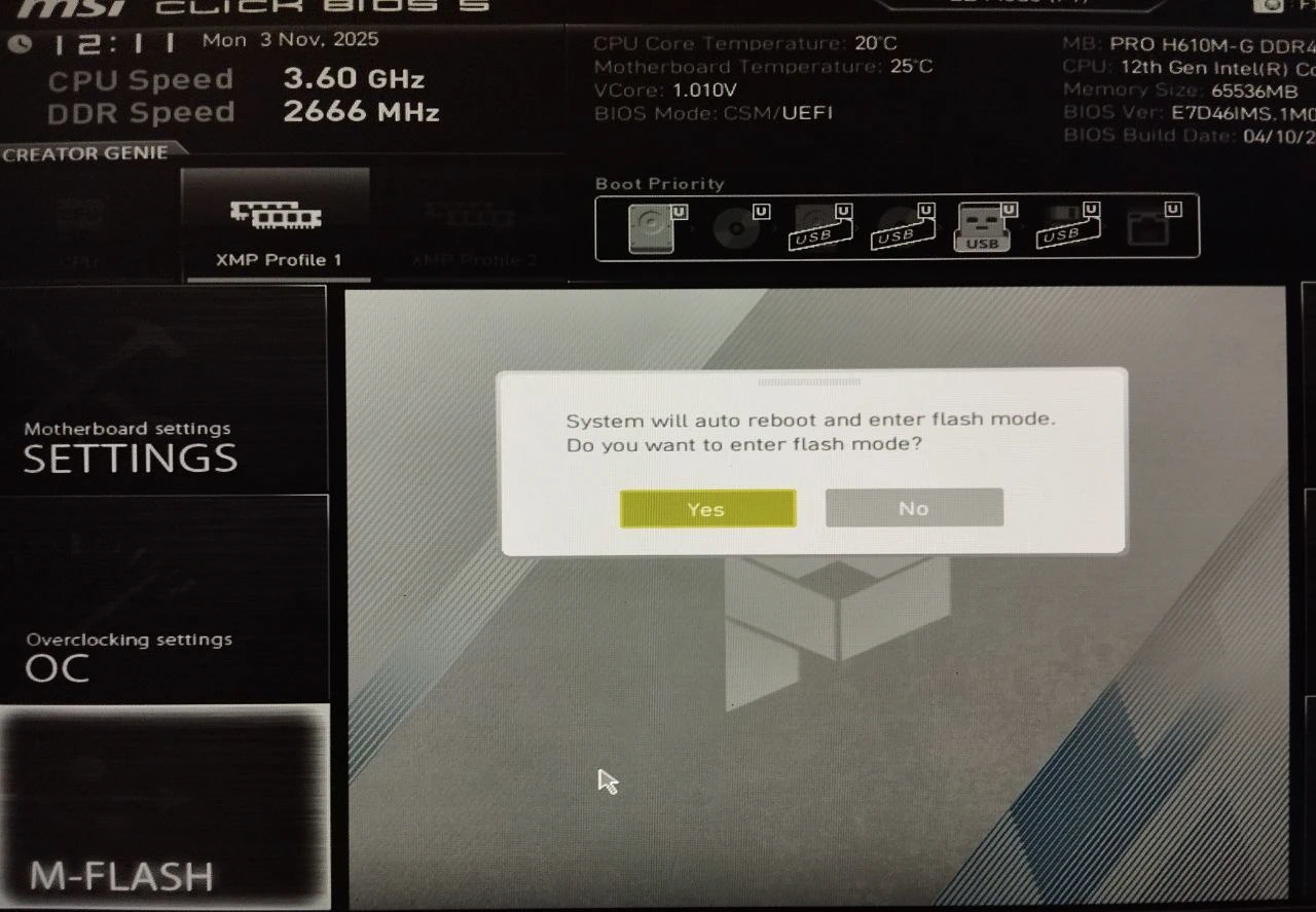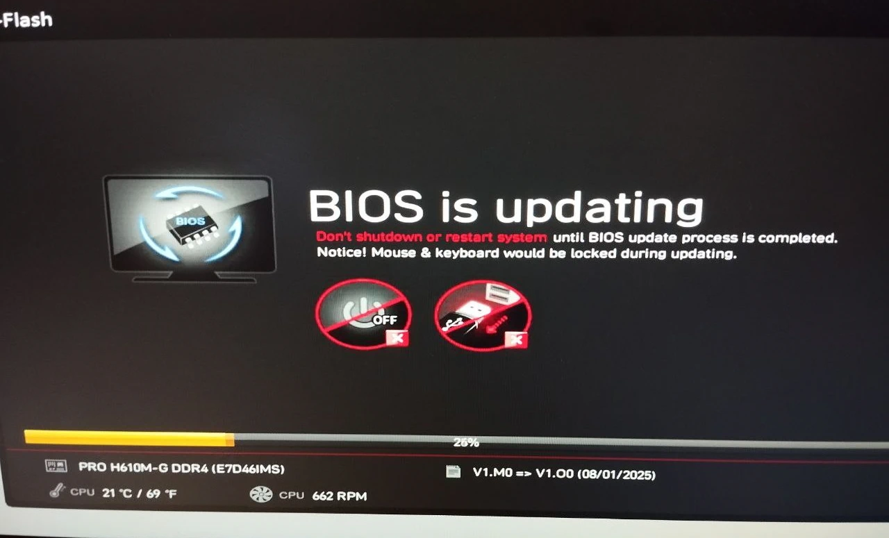 Последняя версия bios (7D46v1O) для бюджетных плат от MSI PRO H610M-G DDR4, превращает меню bios в белый экран, сам биос при этом не ломаеться, все продолжает работать как и до прошивки, просто при входе в меню bios мы видим белый экран.
